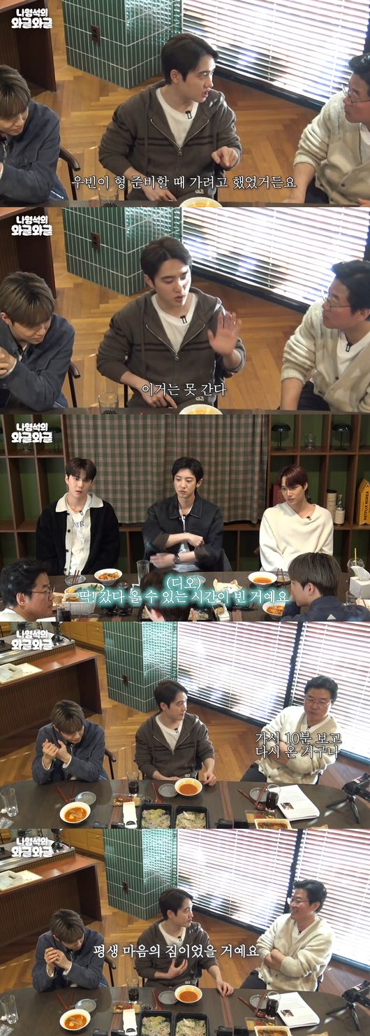 "그 와중에 넌 또 결혼실을 갔다 왔더라"라는 나영석의 말에 디오는 "잠깐 갔다 왔다. 원래 못 갈 뻔했다"고 답했다.