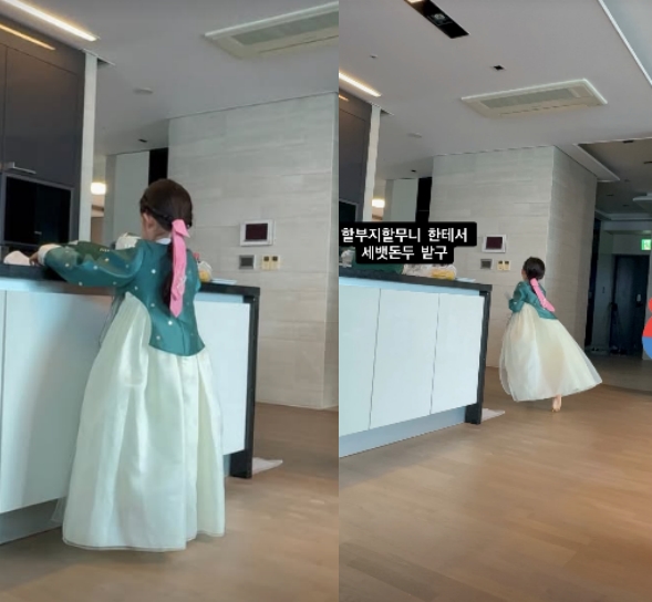 최지우는 “할부지 할무니한테서 세뱃돈도 받구”라며 용돈을 받은 후 신난 발걸음을 자랑하는 딸의 모습을 공개하기도.