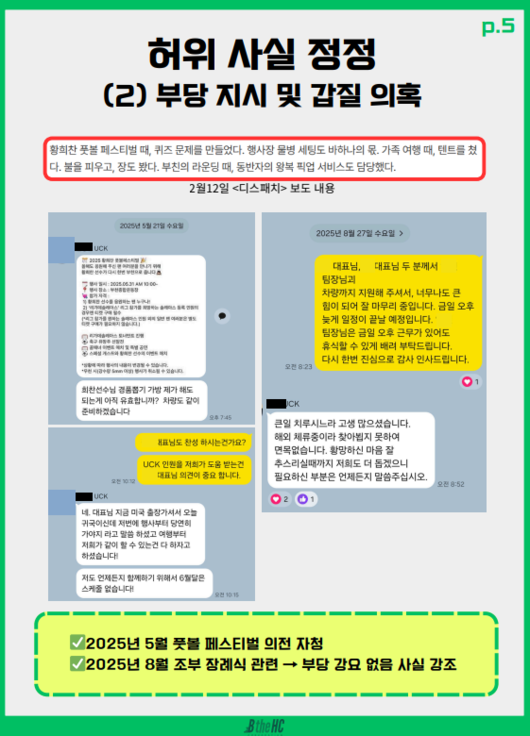 보도에서 제기된 ‘갑질’ 프레임을 두고는 구체 항목별 반박이 이어졌다. 소속사는 ‘부당 지시 및 갑질 의혹’과 관련해 “당사의 사양에도 의전을 강행한 건 상대 측”이라는 주장과 함께 텐트 설치·철거, 불 피우기, 장보기 등은 가족이 직접 수행했다고 적시했다. ‘장보기 지시’로 알려진 대화 역시 “숙소 가는 길에 마트가 있다는 정보성 안내를 왜곡했다”는 취지로 설명했다.