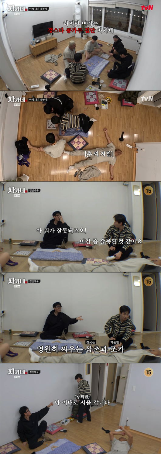 딘딘은 “방송 나가면 논란 생긴다”라며 경고했으나, 차승원은 “무슨 논란이 생겨”라며 아랑곳하지 않고 게임을 밀어붙였다. 지친 추성훈은 결국 바닥에 드러누웠고, 딘딘은 “한국에서 가족끼리 원래 윷놀이하다가 많이 싸워요”라며 뼈 있는 농담을 던졌다.