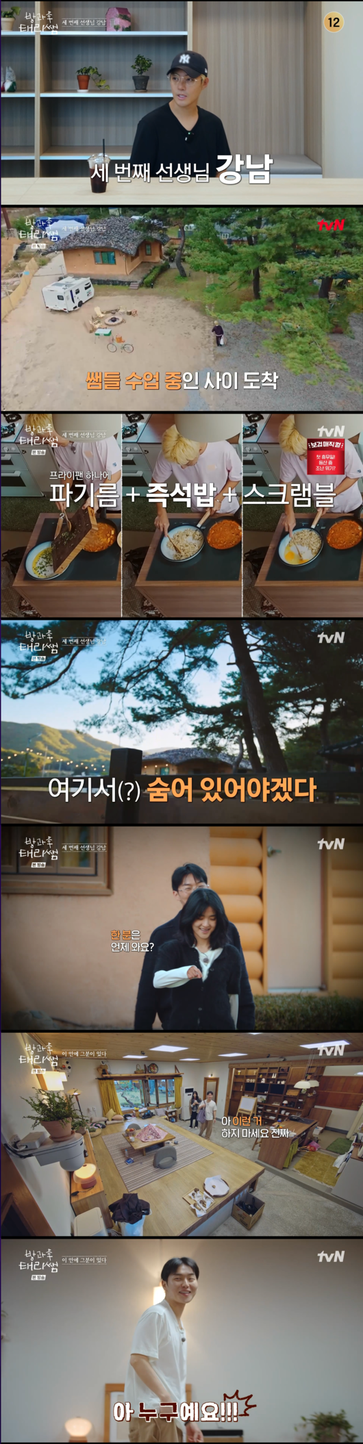 요리를 마친 강남은 “여기서 숨어 있어야겠다”라며 몸을 숨겼고, 곧이어 숙소에 들어온 김태리와 최현욱은 차려진 밥상을 보고 깜짝 놀랐다. 최현욱은 “아 누구예요. 어디 있어”, “재밌다 누나”라고 외치며 정체 모를 선생님의 존재에 흥분을 감추지 못했고, 김태리 역시 웃음을 터뜨렸다.