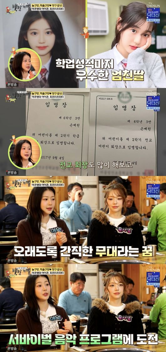 예원도 아이돌의 꿈을 꾸고 있었다며 “학창시절 반장과 회장을 열심히 했다. 전교 회장도 많이 하고 학교 생활 열심히 했다. 언니처럼 마음에 품고 있다가 서바이벌 프로그램에 나가서 거기서 좋은 경험을 하고 이 회사에 들어와서 같이 데뷔를 하게 됐다”라고 밝혀 놀라움을 안겼다.