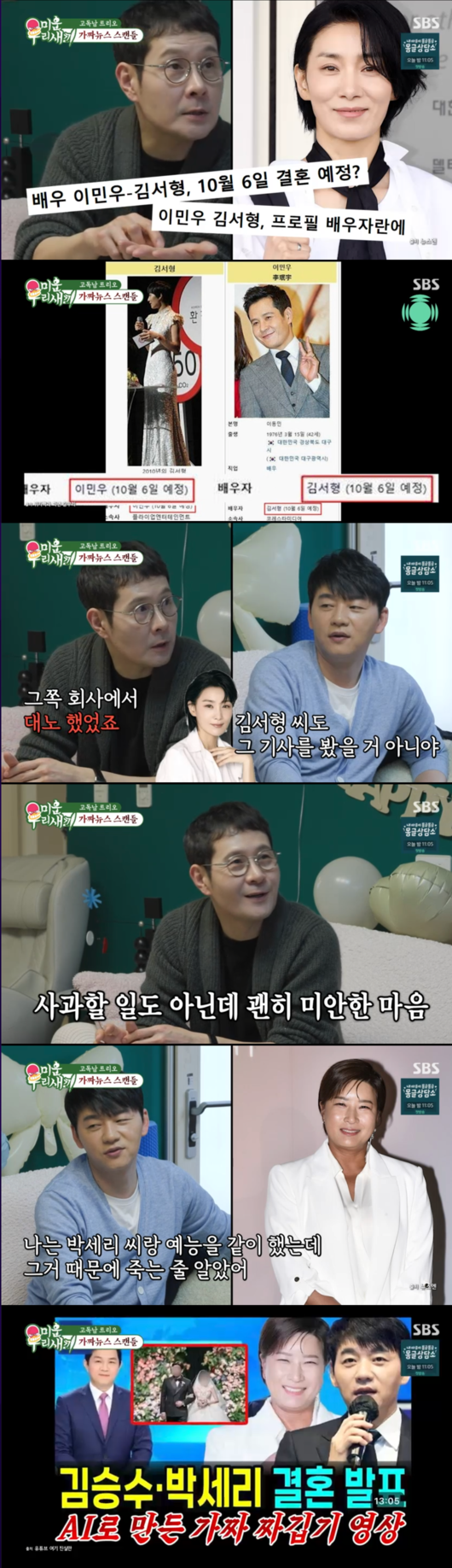 이민우는 “김서형과 이미 결혼한 사이라는 가짜 뉴스까지 있었다”라며, 심지어 “포털사이트에서 바로 해명을 했다. 데이터 입력 실수로”라고 밝혀 모두를 놀라게 했다. 전혀 친분조차 없는 사이임에도 시스템 오류로 인해 순식간에 부부로 묶여버린 황당한 해프닝이었던 것.