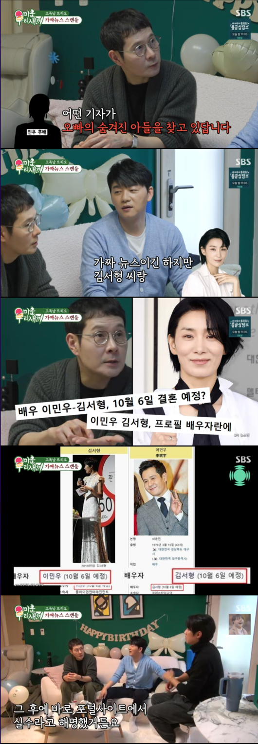 심지어 배우 김서형과 이미 결혼한 사이라는 가짜 뉴스까지 퍼졌던 사실을 밝히며, “포털사이트에서 바로 해명을 했다. 직원이 데이터 입력 실수로”라고 그 전말을 공개했다. 이민우는 김서형과 “전혀 친분이 없다”고 선을 그었다.