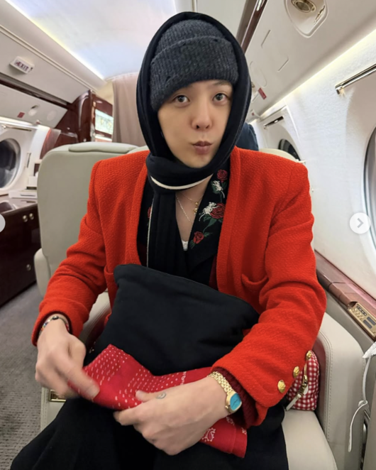 먼저 비행기 내부로 보이는 공간에서 찍은 사진이 눈길을 끌었다. 공개된 사진 속 지드래곤은 붉은 재킷에 비니와 스카프를 두른 채 좌석에 앉아 카메라를 향해 장난기 어린 표정을 짓고 있다. 일반 여객기와는 다른 넓은 가죽 좌석과 내부 구조가 포착되며, VIP 전용기 내부가 아니냐는 추측이 이어지고 있다.