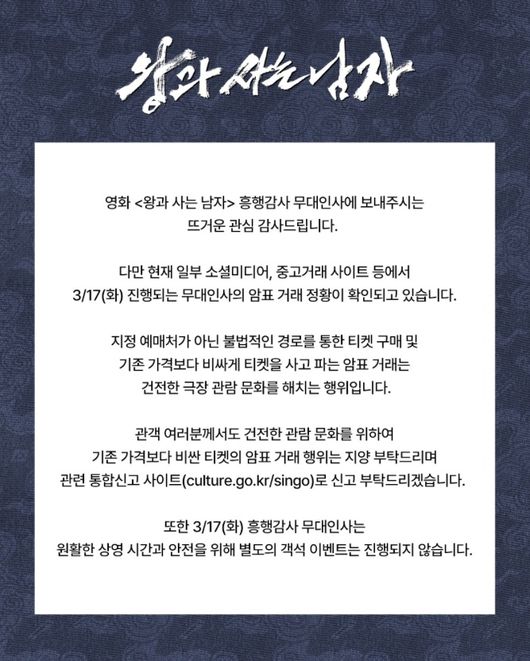 이에 '왕과 사는 남자' 측은 "지정 예매처가 아닌 불법적인 경로를 통한 티켓 구매 및 기존 가격보다 비싸게 티켓을 사고 파는 암표 거래는 건전한 극장 관람 문화를 해치는 행위"라고 강조하며 관객들에게 암표 거래를 지양하고 통합신고 사이트에 신고해줄 것을 당부했다.