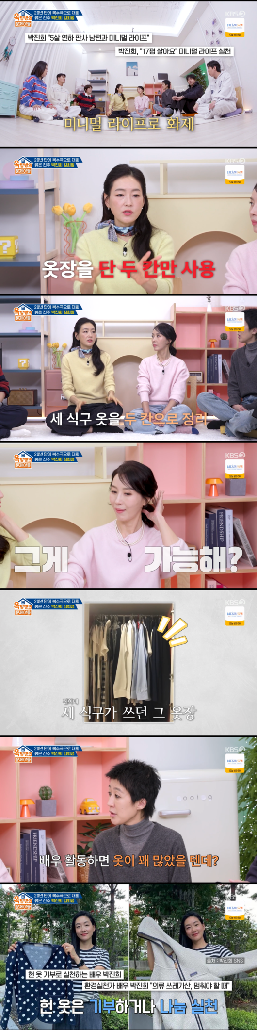 특히 박진희는 과거 환경을 위한 극강의 미니멀 라이프를 실천하기도 했다고. 한동안 17평 집에서 세 식구가 단출하게 살았다는 박진희는 “세 식구의 옷이 옷장 단 두 칸에만 있었다”고 고백해 놀라움을 자아냈다. 박진희는 환경에 관심을 갖기 시작한 후부터 “헌 옷은 기부하고 나눔을 했다”고 덧붙여 눈길을 끌었다.