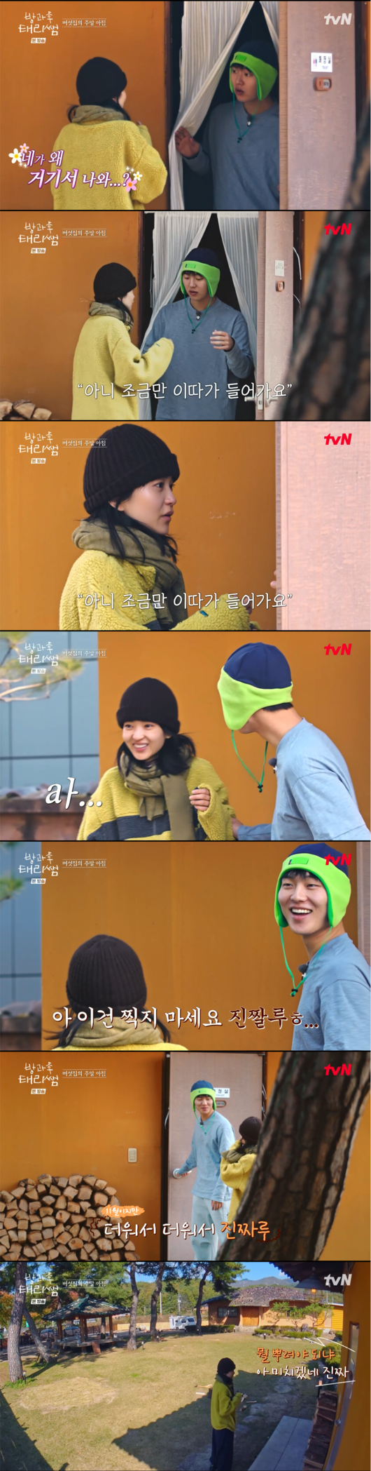 김태리는 화장실에 가기 위해 문을 열었다가, 안에서 나오던 최현욱과 정면으로 마주치며 "아 깜짝이야"라고 비명을 질렀다. 갑작스러운 상황에 최현욱은 횡설수설하며 "괜찮아요 누나?"라고 물었지만, 정작 표정에는 당황한 기색이 역력했다.
