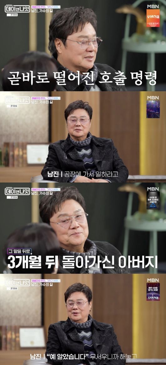 김주하는 남진에게 아버지에 대한 이야기를 꺼냈다. 남진은 “내가 노래하는지 전혀 모르셨다. 병상에 너무 오래 누워계셔서. 서울에서 대학을 잘 다니고 있는 줄 아셨다. 병원에서 (프로그램을) 보시다가 난리가 났다”라고 회상했다.