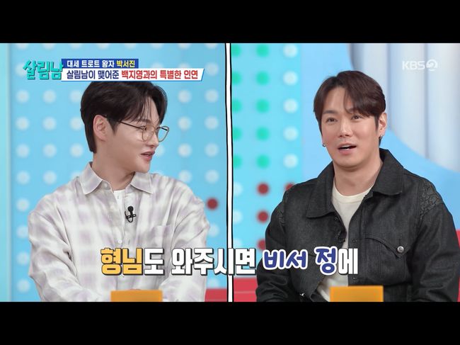 21일 방영된 KBS2TV 예능 '살림남2'에서는 박서진 공연을 위해 지원 사격으로 등장한 백지영이 백스테이지에서 박효정, 박서진 남매와 대화를 나누었다. 원조 살림남 MC로서, 오랜만인 백지영과의 조우는 즐거웠다.