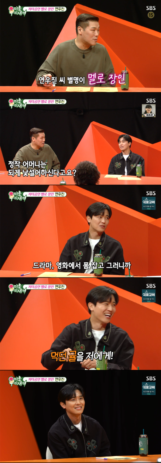 19일 오후 방송된 SBS '미운 우리 새끼'(이하 '미우새')에서는 '믿고 보는 멜로 장인' 배우 연우진이 등장해 솔직하고 거침없는 입담을 펼쳤다.