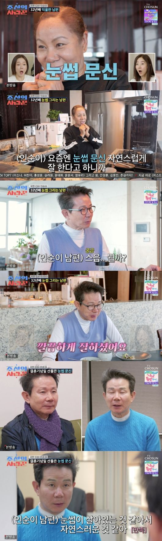 인순이는 남편과 함께 눈썹 문신숍을 찾았다. 남편의 오랜 소원을 들어준 인순이. 남편은 “새로 난 것 같다”라며 너무나도 만족스러운 모습을 보였다. 남편은 100점짜리 선물이라며 행복함을 감추지 못했다.