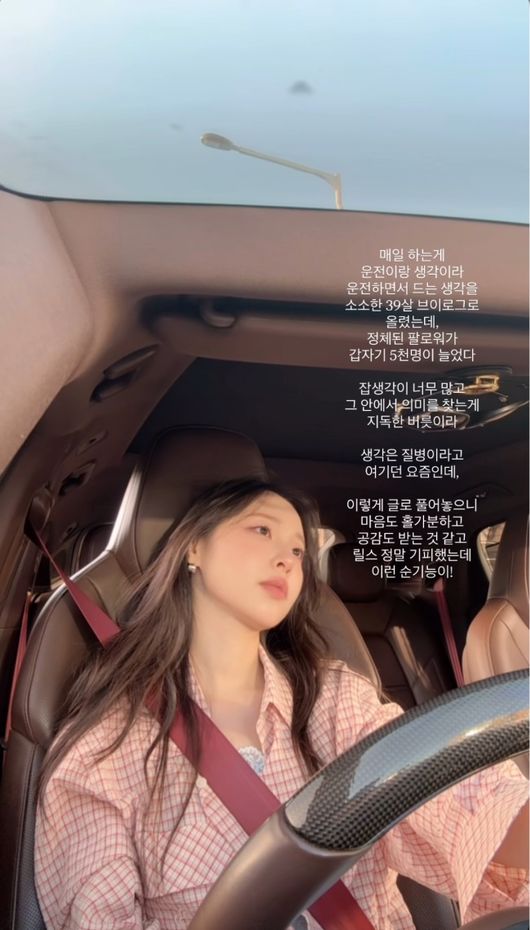사진과 함께 이솔이는 “매일 하는 게 운전이랑 생각이라 운전하면서 드는 생각을 소소한 39살 브이로그로 올렸는데 정체된 팔로워가 갑자기 5000명이 늘었다”라고 말문을 열었다.