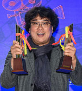 2019.11.13 20: 55영평상 트로피 들고 환호하는 봉준호 감독,'기생충 3관왕이에요'