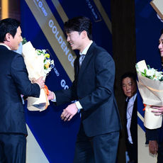 2025.12.09 17: 57염경엽 감독 올해의 감독상 수상에 꽃다발 전하는 박해민-신민재