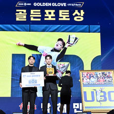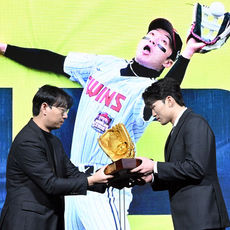 박해민에 골든포토상 트로피 전달하는 지형준 회장